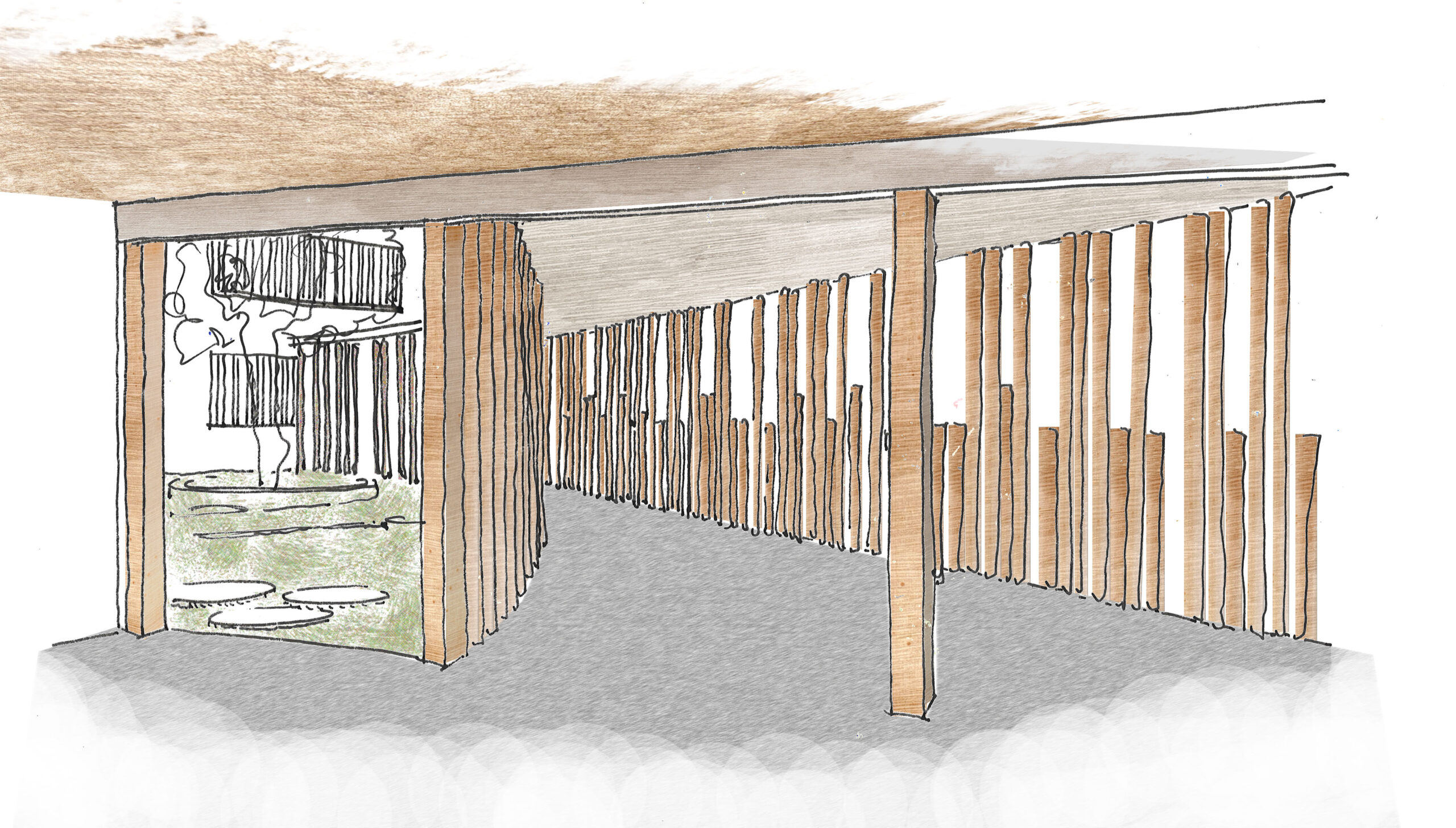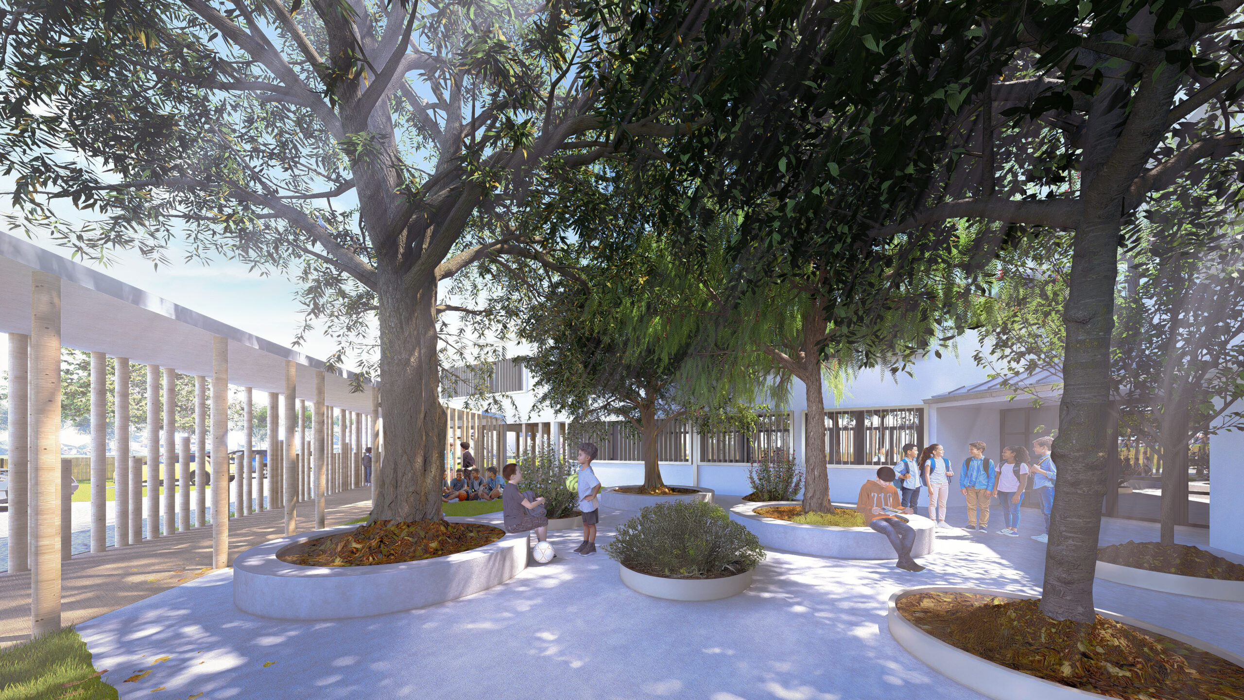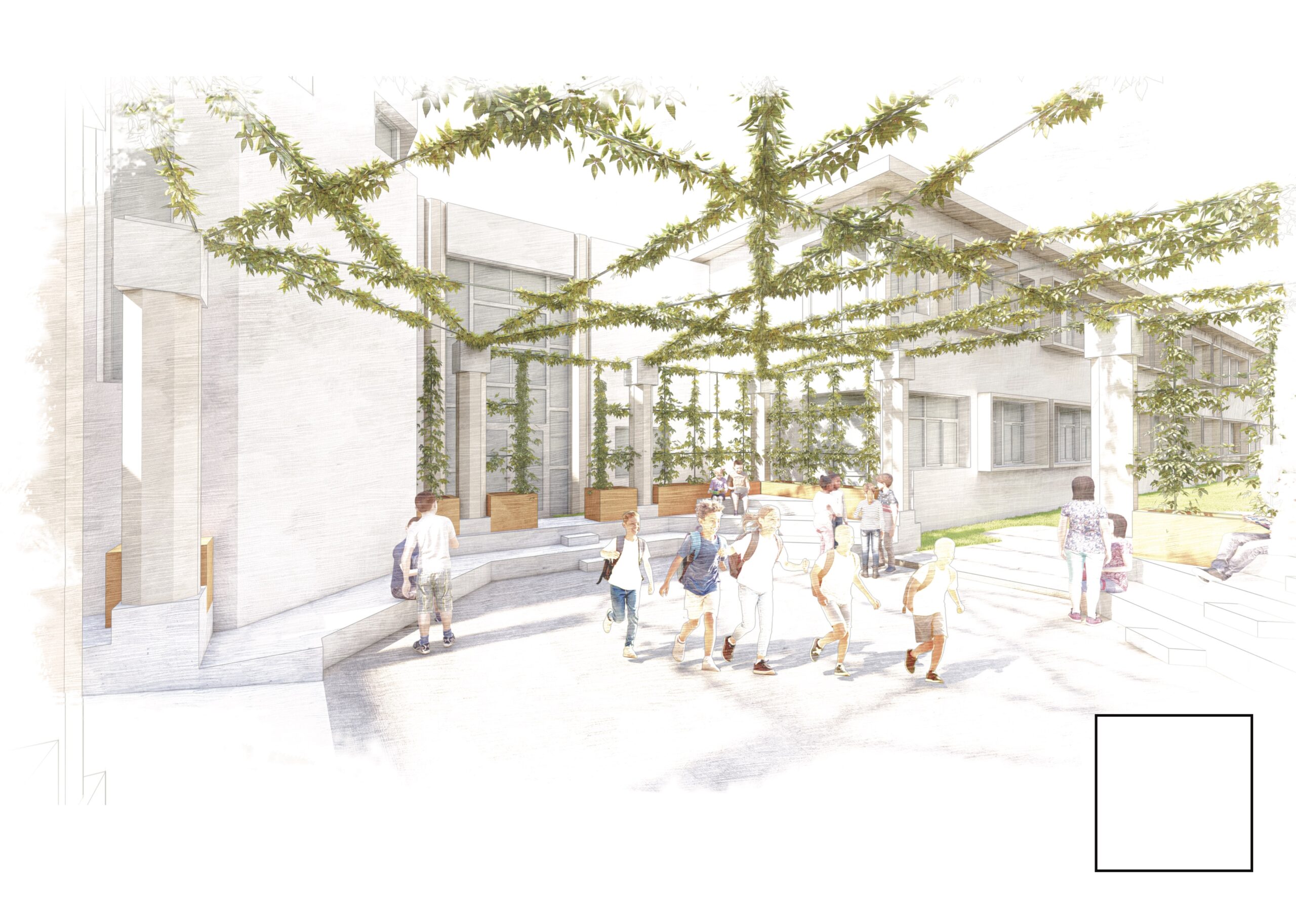 Le projet consiste à créer une vraie cour ombragée avec la coursive en « fond de scène » qui anime et marque la limite de l’espace extérieur du collège. Le jeu de structure des poteaux devient la rive de la cour, son lien et sa limite, il met en scène la circulation horizontale et l’espace de la cour.
